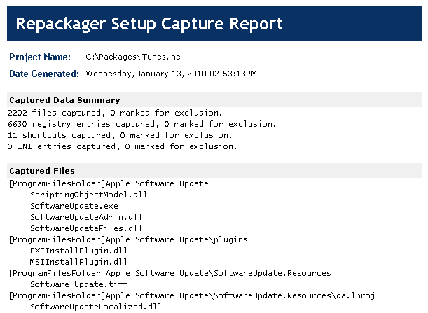 The report also indicates which of the files, shortcuts, .ini file entries, or Registry entries, if any, have been marked for exclusion. Those marked for exclusion are not included in the Repackager project.