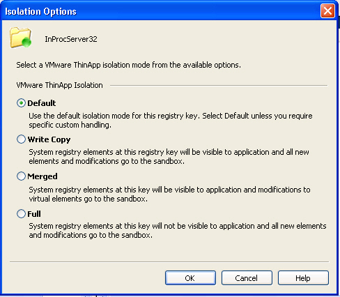 FullYou would use Full isolation when a ThinApp application needs to run on a machine where earlier or later versions of the same application are either installed or were not uninstalled correctly. For directories and registry keys that have Full isolation, the ThinApp application will not be aware of any host computer file that might exist, and it sees only virtual files and registry keys at fully isolated locations.