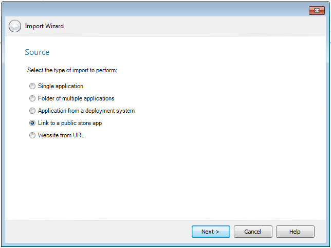 - Select Link to a public store app and click Next . The Public Store Selection panel opens.
