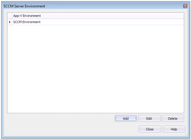 - Click App-V Virtual Environments in the ribbon and then select SCCM Server Environment . The SCCM Server Environment dialog box opens, listing any defined App-V virtual environments.