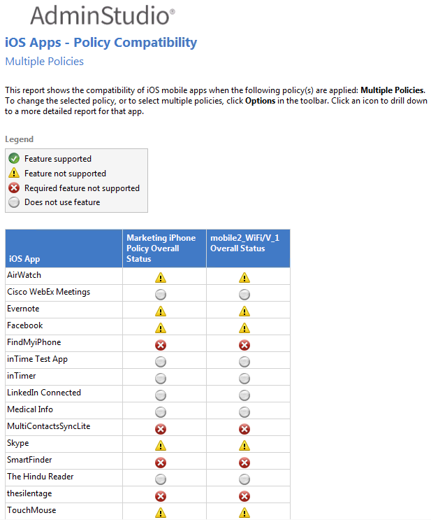 - This report displays an icon to indicate the compatibility of each iOS mobile app with the selected policy.