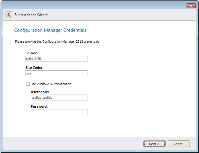 On the Configuration Manager Credentials panel, specify Configuration Manager connection credentials.