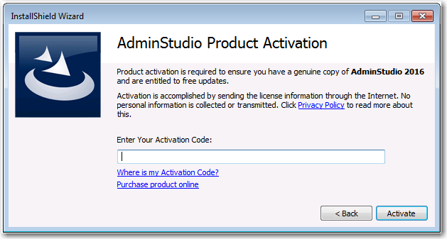 - Select Activate or Purchase AdminStudio and click Next . The AdminStudio Product Activation dialog box opens, and you are prompted to Enter Your Activation Code .