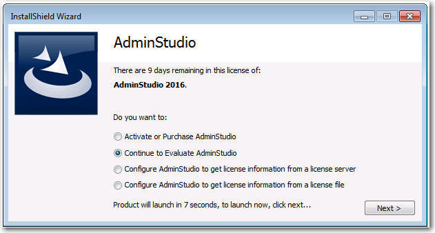 - Launch AdminStudio ZENworks Edition. The following dialog box opens, prompting you to either activate or evaluate AdminStudio.