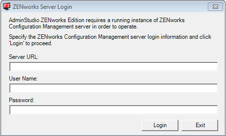 - Click Finish . AdminStudio launches. You will then be prompted to log in to a ZENworks Configuration Management server on the ZENworks Server Login dialog box.
